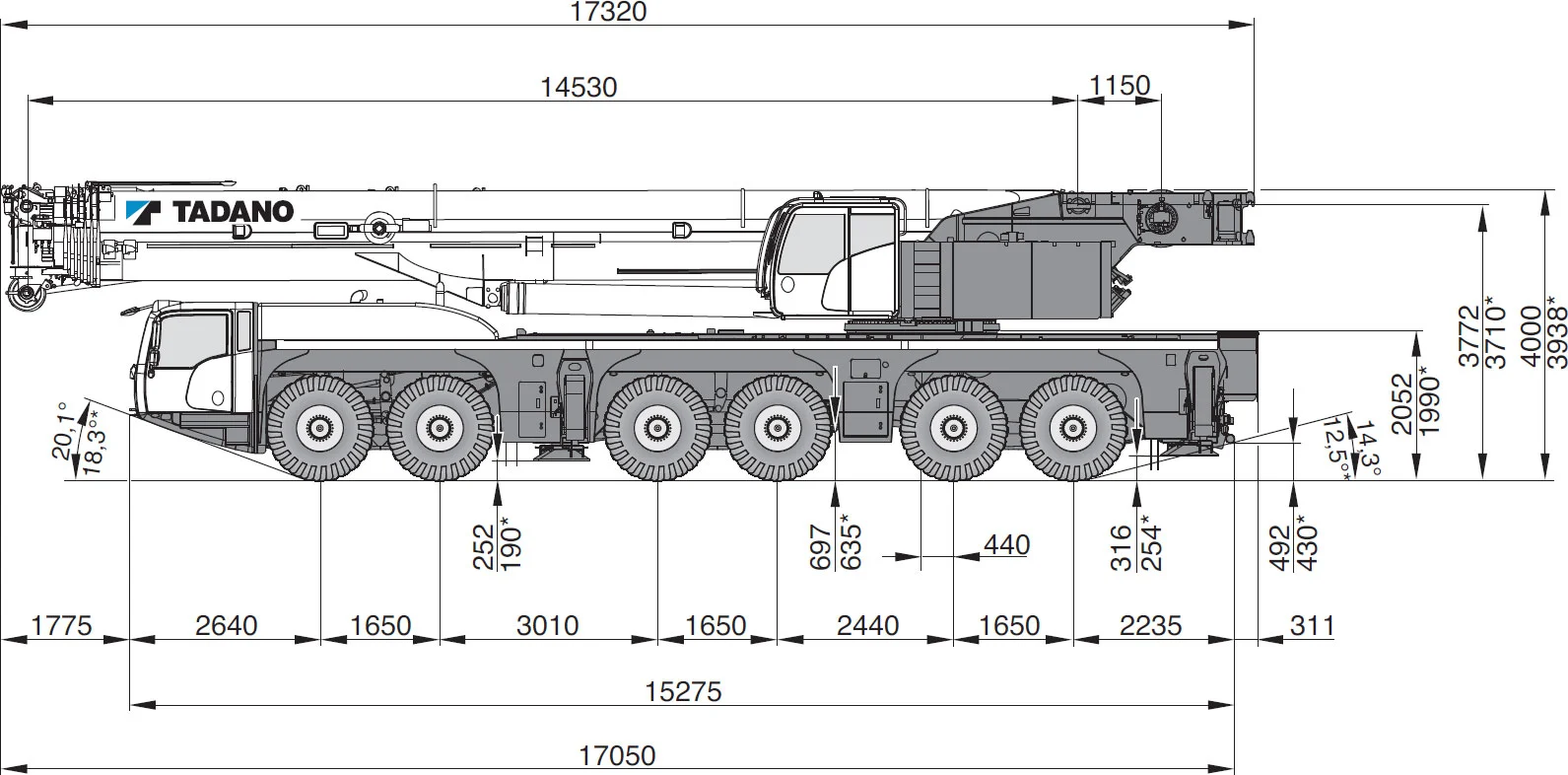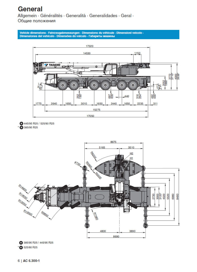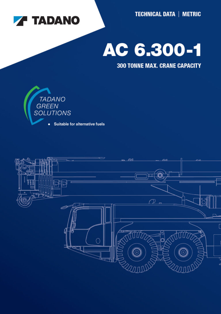 The 300 t Tadano AC 6-300-1 is a 300-ton class 6-axle all-terrain crane that balances heavy lifting capability with flexibility for tight or complex job sites.